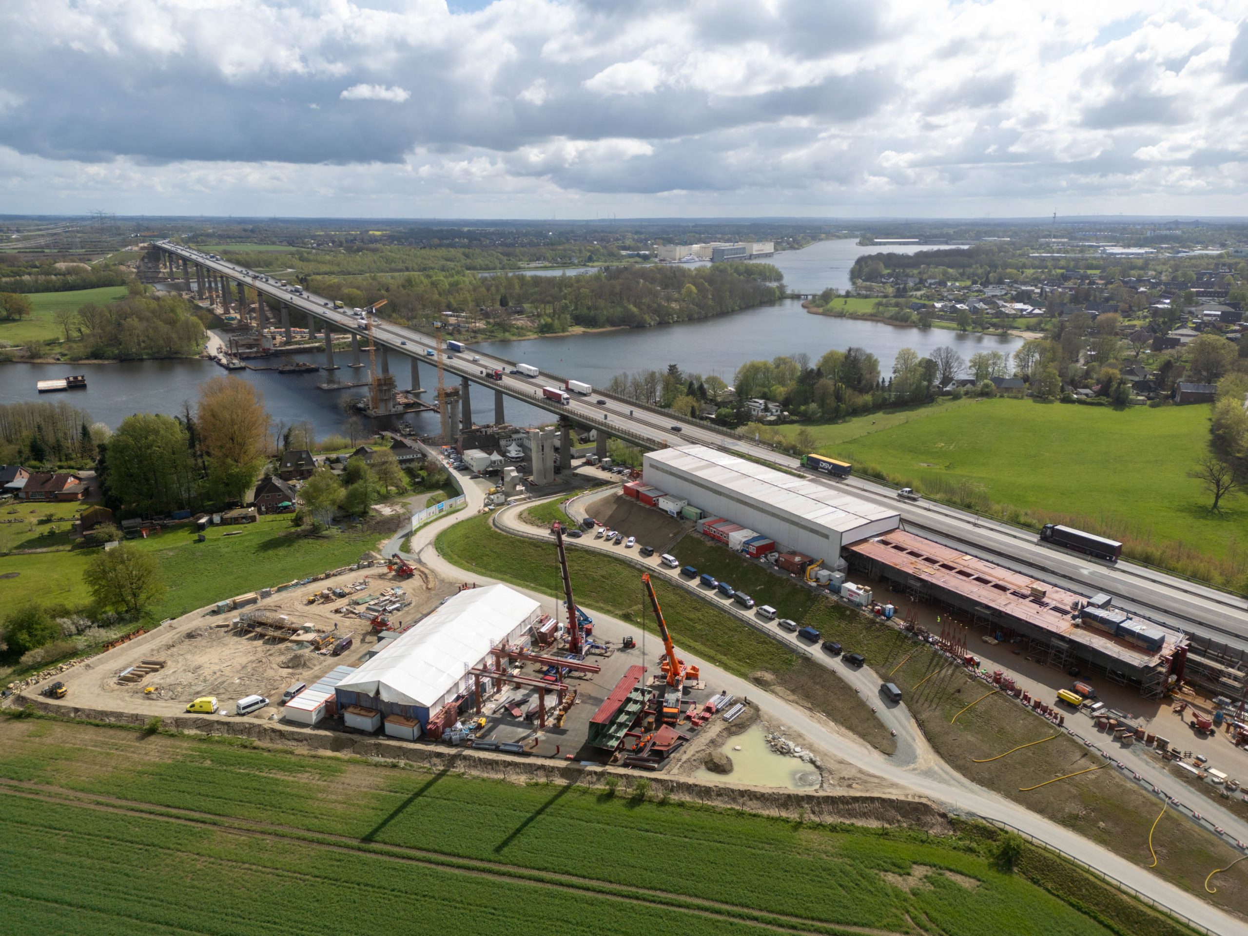 Ein Jahr nach dem Spatenstich für den Ersatzneubau der Rader Hochbrücke konnte am 19. April der Startschuss für den Verschub des 1. Teilbauwerks gegeben werden. Aus der Taktfabrik gingen mehr als 1.000 Tonnen Stahl in 80 Meter Länge auf die Reise Richtung Nord-Ostsee-Kanal. Zu diesem 1. Verschub kommen bis Ende 2025 noch 13 weitere.