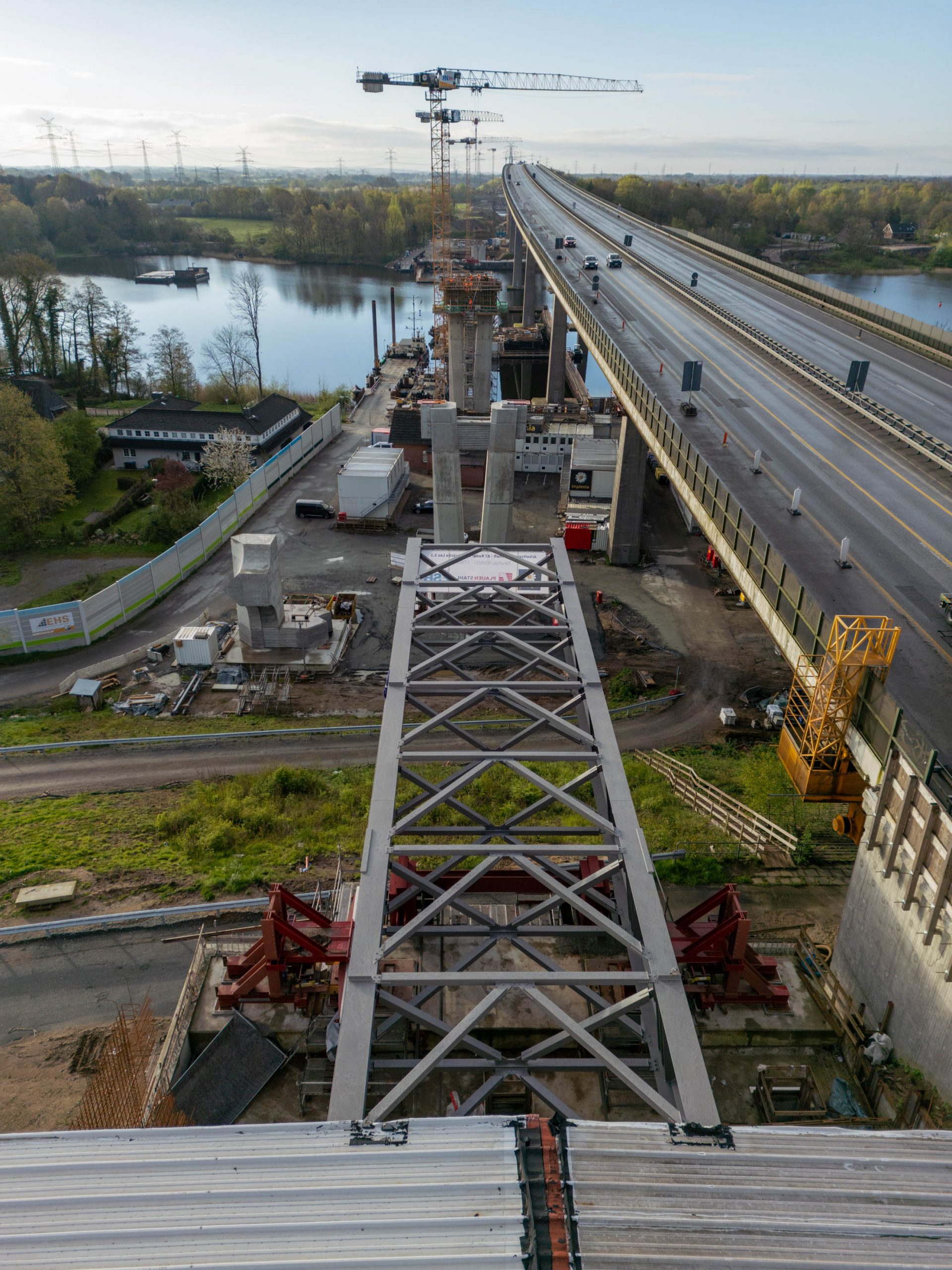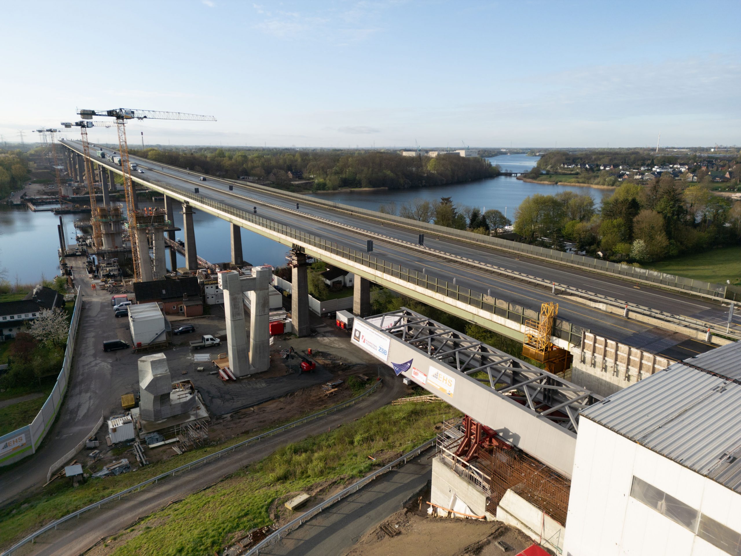 Die Brücke wird im Taktschiebeverfahren erbaut. Das Stahltragwerk wird dabei von den beiden Widerlagern aus in Richtung Nord-Ostsee-Kanal geschoben. Das Element im Bereich über dem Nord-Ostsee-Kanal wird über Litzen eingehoben werden.