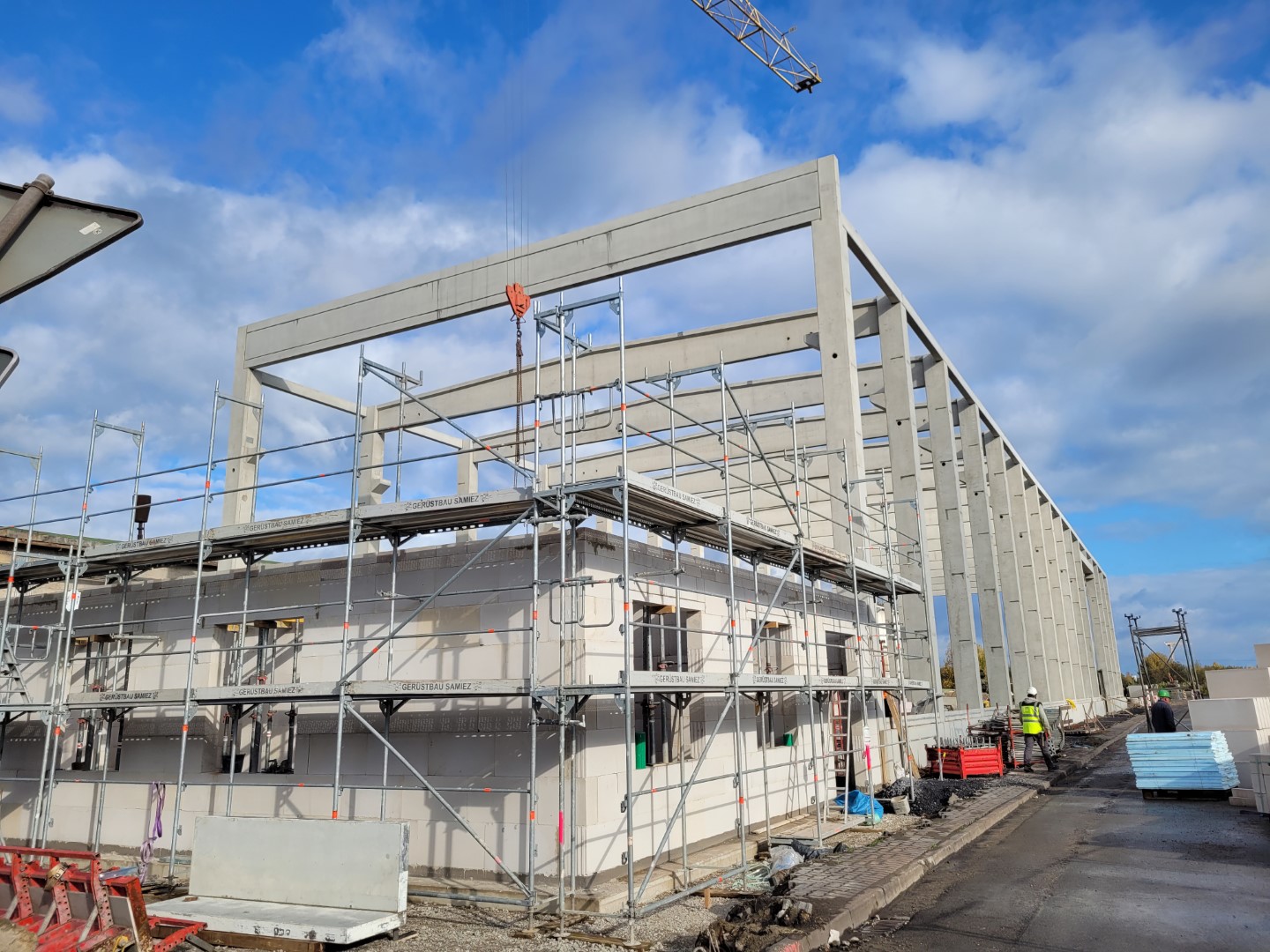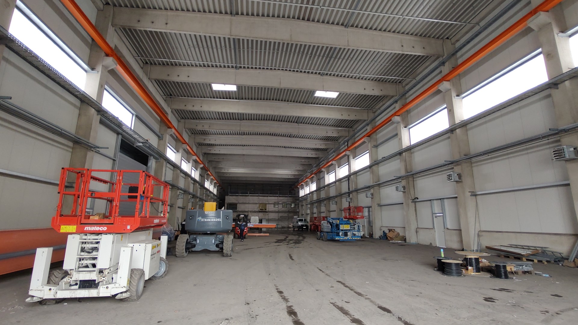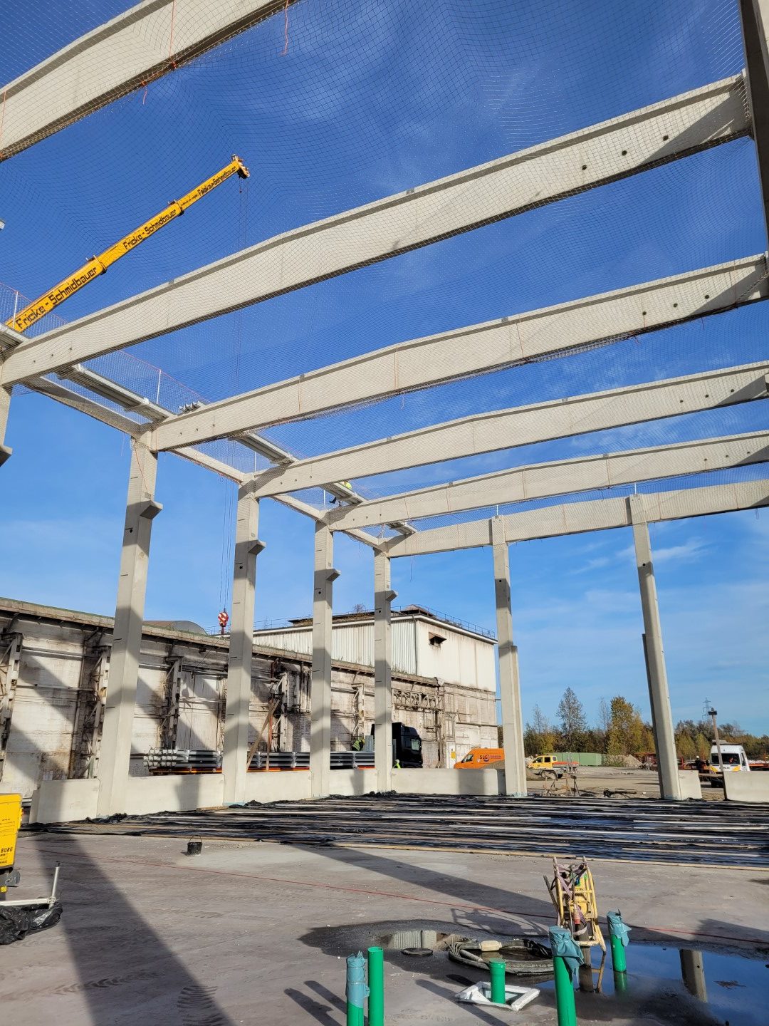Dabei handelt es sich um eine Halle mit Abmessungen von ca. 90 x 25 m Grundfläche, die in Stahlbetonfertigteilbauweise errichtet wurde. Der angrenzende dreigeschossige Bürotrakt mit einer Gesamtfläche von ca. 1200 m² wurde in klassischer Massivbauweise ausgeführt. Die neue Werkstatt steht auf dem Gelände einer alten Lagerhalle, die zuvor zurückgebaut wurde. Nach anfänglichen Schwierigkeiten aufgrund von Hindernissen im Baugrund konnte die Werkstatt in nur fünf Monaten Bauzeit errichtet werden.