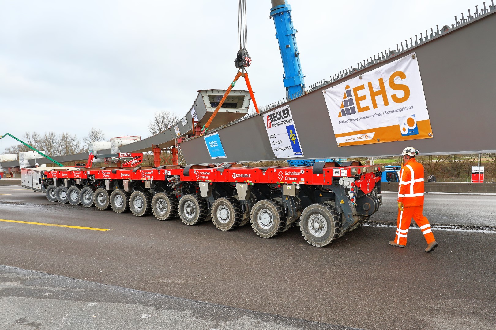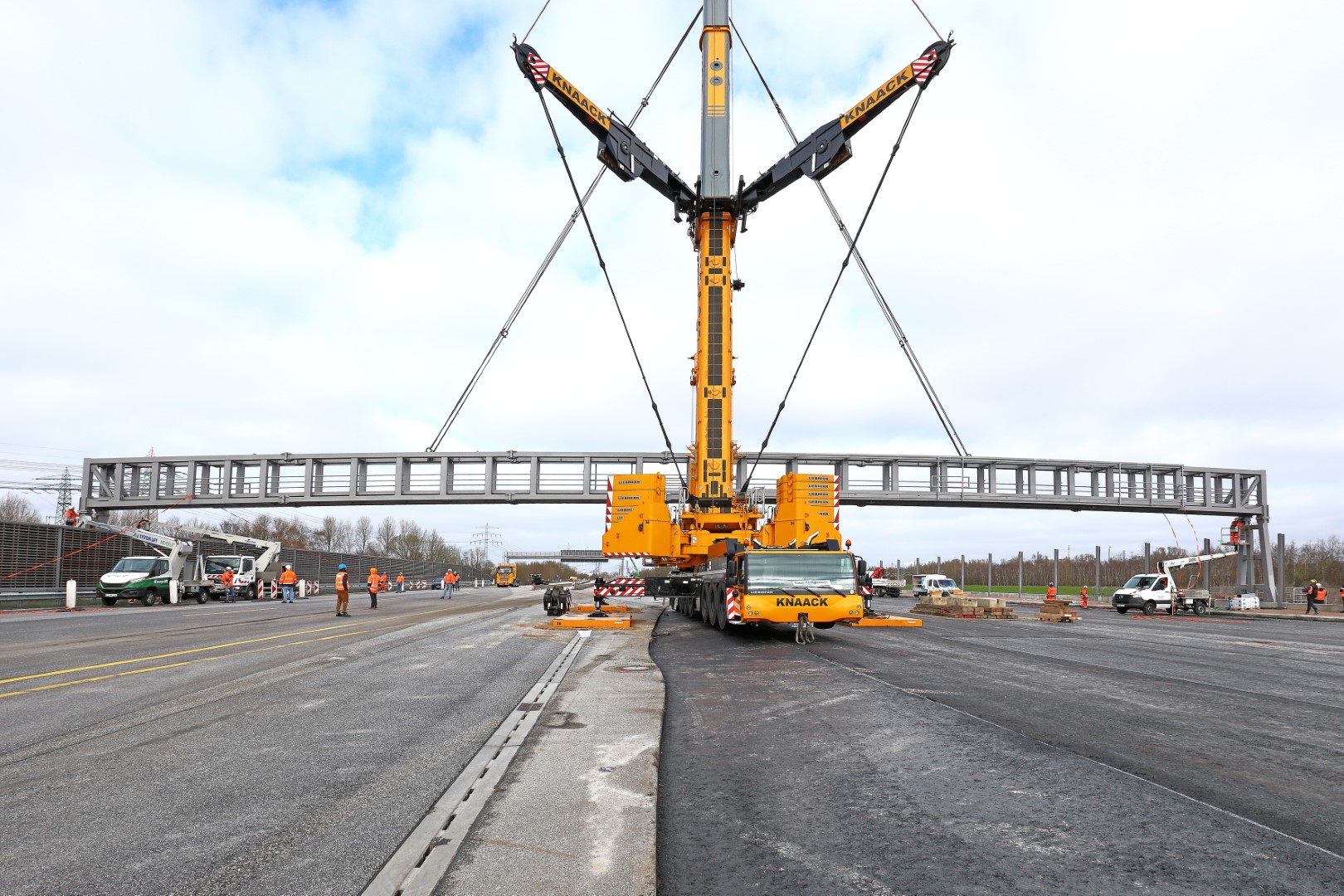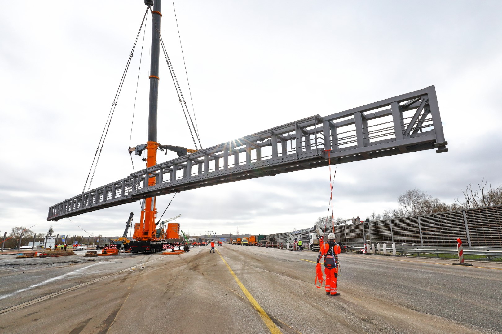 Doch damit nicht genug: Bereits während des Brückeneinhubes liefen unweit entfernt im nördlichen Baufeld die vorbereitenden Arbeiten für den Einhub der längsten Verkehrszeichenbrücke Deutschlands auf Hochtouren. Mit knapp 100 Tonnen Gesamtgewicht überspannt die Stahlkonstruktion beide Richtungsfahrbahnen der A7 auf rund 70 Meter!